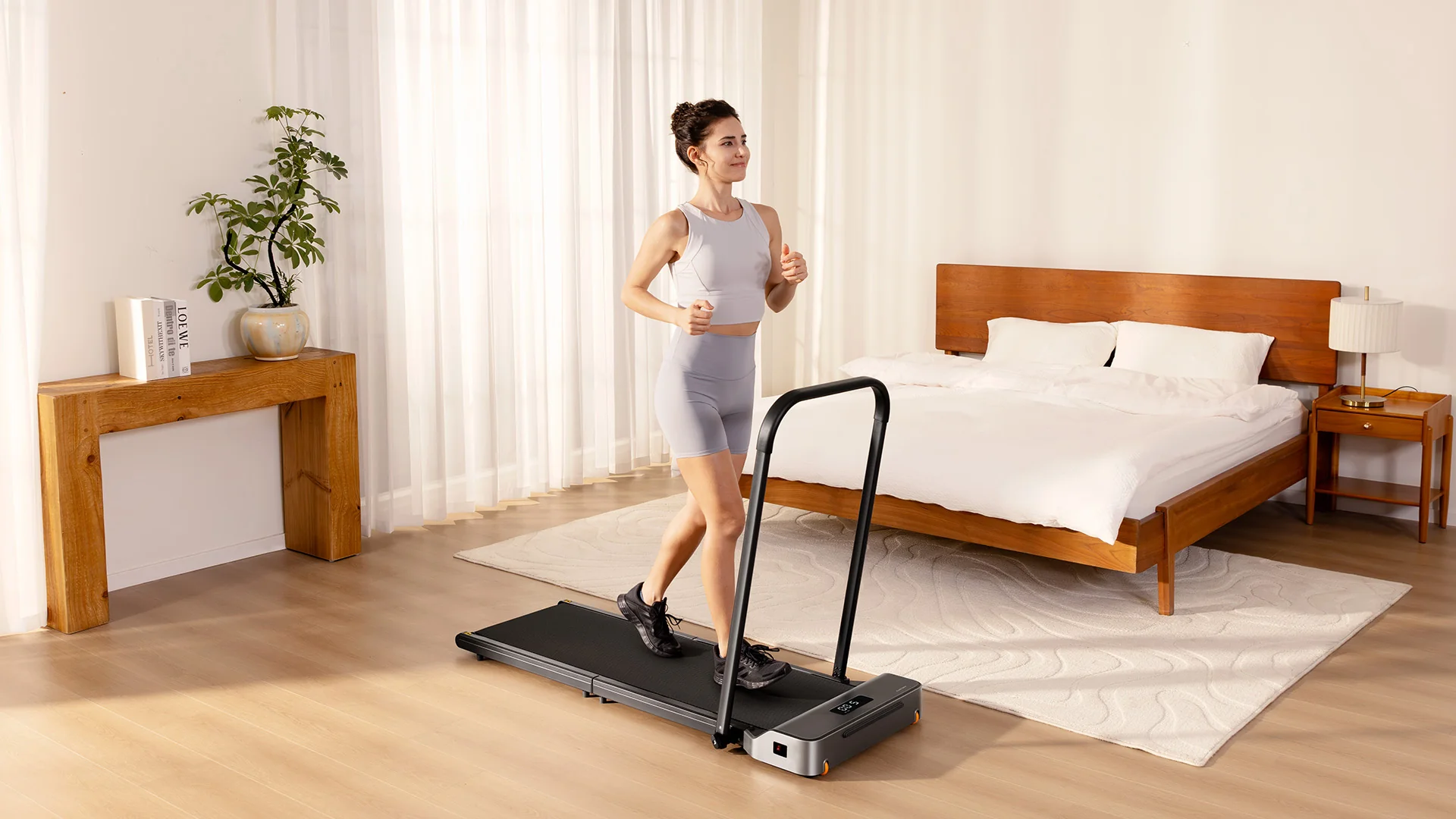 With a body as thin as 43mm (1.7 in), it’s incredibly slim and easy to move — yet strong enough to support up to 242 lbs. Whether you want a supported walk with the handrail on, or a clean, open walking surface without it, you can switch setups in seconds.